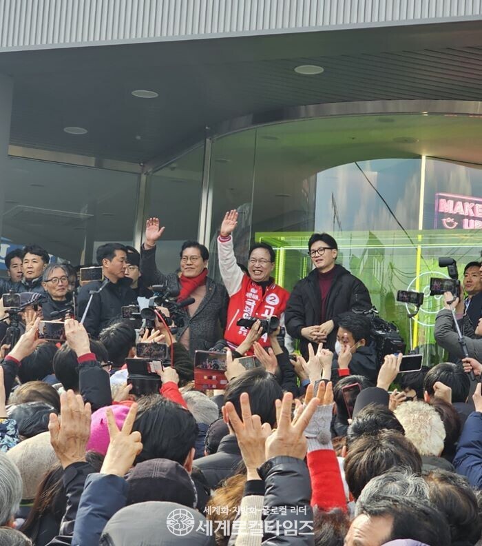 ▲ 지난 8일 수지구청역 사거리, 국민의힘 한동훈 비상대책위원장과 고석 후보 거리 인사 (사진=고석 캠프) |