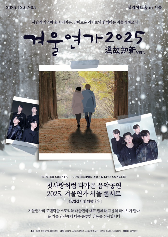 공연 개요를 살펴보면, ‘겨울연가 2025 온고지신 ver.’은 2025년 12월 2일(화)부터 5일(금)까지 매일 오후 2시와 오후 7시, 하루 두 차례 서울 강남구 선릉로 111길 6, 9호선 선정릉역 인근에 위치한 성암아트홀에서 열린다. 출연은 컨템포디보 단독 무대로 꾸며지며, AI 리마스터링 드라마 영상과 라이브 크로스오버 보컬이 결합된 형식으로 진행된다. 조명과 영상, 음악이 어우러진 무대 위에서 네 남자의 목소리는 서울의 겨울밤을 채우는 또 하나의 한류 풍경이 될 전망이다.