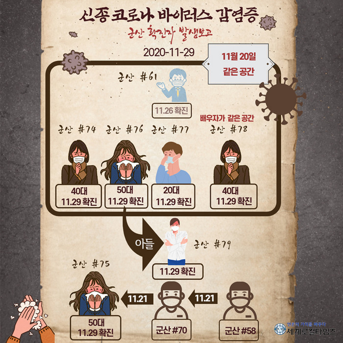 29일 전북도와 군산시 보건당국에 따르면 군산 61번 확진자 관련 4명과, 이어진 n차 감염 1명, 70번 확진자 관련 1명이다.