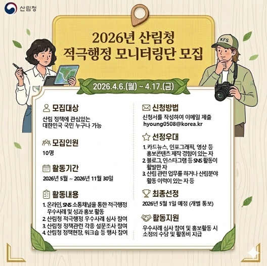 신청 방법은 산림청 누리집 공고문에 첨부된 지원서를 작성해 이메일로 제출하면 된다. 특히 카드뉴스·영상 등 콘텐츠 제작 경험이 있거나 SNS 활동이 활발한 지원자는 우대받을 수 있다.