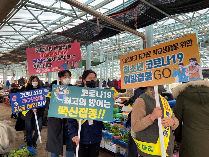 이날 보건소 직원들은 소형 현수막, 피켓, 어깨띠 등을 활용해 군민들에게 코로나19 예방접종의 중요성과 감염병 예방 안전수칙, 코로나19 예방 추가접종에 대해 안내했다.
