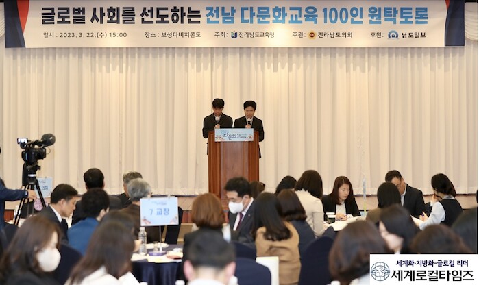 [세계로컬타임즈 김명진 기자] 전라남도교육청이 22일 보성다비치콘도에서 전남도의회 주관, 남도일보 후원으로 2023 전남 다문화교육 대전환 100인 원탁토론을 개최했다.
