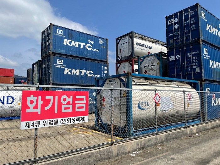 관련법에 따르면 위험물이 든 컨테이너는 지정된 별도의 옥외 저장소에 보관해야 한다.