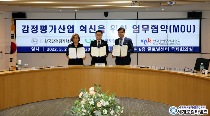 [세계로컬타임즈 조주연 기자] 한국국토정보공사가 “최송욱 공간정보본부장과 정수연 한국감정평가학회장, 이종혁 한국공인중개사협회장이 25일 한국국토정보공사 서울지역본부에서 ‘감정평가산업 혁신을 위한 업무협약’을 체결했다”고 밝혔다.