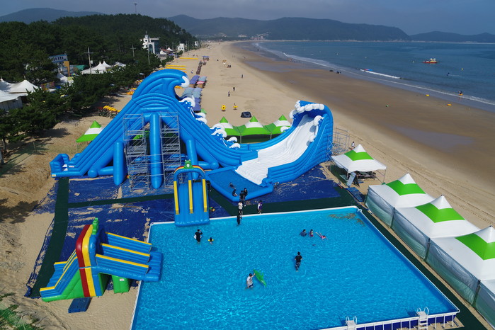 | ▲ 완도군 신지명사십리 해수욕장에 설치된 풀장에 에어바운스와 슬라이드 모습. |