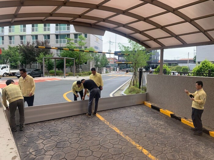 이번에 설치한 수동식 물막이판은 높이 50cm로 알루미늄, 스테인리스 등 재질의 판을 이용해 집중호우 시 지하주차장의 빗물 유입을 선제적으로 차단해 군민의 재산 및 인명 피해를 예방할 수 있다.