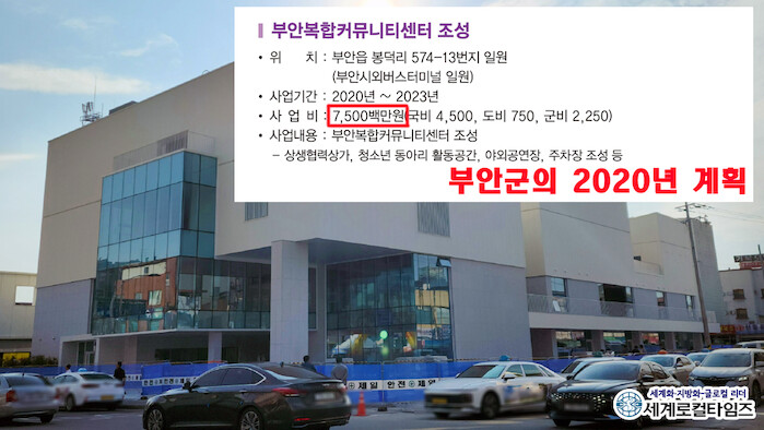 당초 부안군은 75억 원으로 이 건물을 짓겠다고 계획했다. 2020년 이야기다. 하지만 3년만에 사업비는 128억 원으로 53억 원이 늘었다. 국비와 도비는 그대로였으며 부안군민들의 부담만 늘었다.