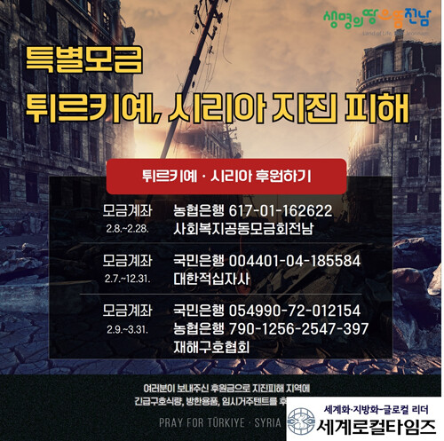[세계로컬타임즈 김명진 기자] 전남도가 튀르키예 남부와 시리아 북부를 강타한 지진으로 고통받는 난민 구호 분위기 확산에 나서고 있다.