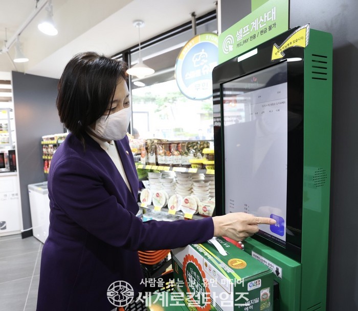 ▲지난해 10월, 당시 박영선 중기부 장관이 스마트슈퍼 1호점에서 셀프계산 등을 시연하고 있다.(사진=ⓒ중소벤처기업부) |