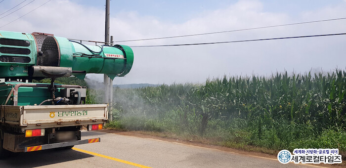 부안군 농업기술센터는 병해충 예찰결과 부안읍 사료용 옥수수 포장에서 발생한 열대거세미나방을 반경 3km이내 5ha를 긴급방제 구역으로 설정해 적용약제를 살포했다.