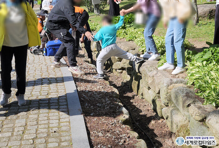 ▲27일 김제시 금산사 잔디광장에서 열린 ‘2024 모악산 뮤직페스티벌’에서 한 아이가 공연장을 둘러싼 수로를 아슬아슬하게 뛰어 넘어 공연장 밖으로 이동하고 있다. |