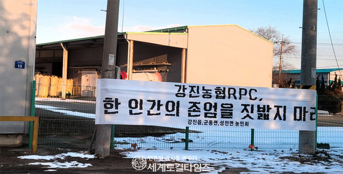 | ▲ 강진농협RPC 쌀 27톤 무단방출 현금화등 여파로 직원 C씨가 극단적인 선택을 한 가운데 깅진농민회에서는 “한 인간의 존엄을 짓밟지 말라”는 현수막을 게시하고 제대로 된 책임소재 규명을 요구하고 있다 |