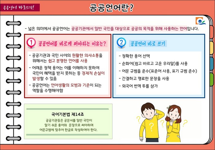 이에 따라 실시된 공공언어 교육을 통해 어려운 행정 용어와 각종 외래어, 한자어를 이해하기 쉬운 우리말로 바꿔 공문서, 계획서, 보고서에 사용토록 함으로써 언어 순화와 행정 접근성 향상에 크게 기여할 것으로 기대된다.