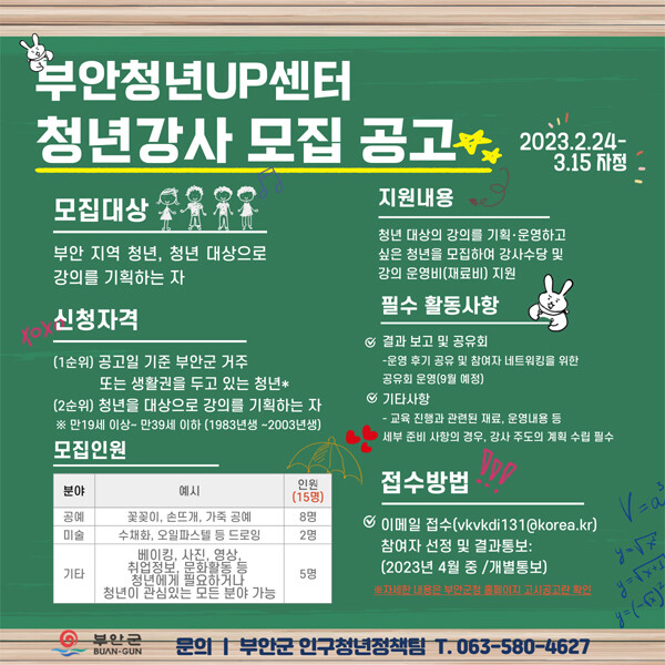[세계로컬타임즈 조주연 기자] 전북 부안군이 청년UP센터 청년강사를 오는 15일 까지 모집한다.