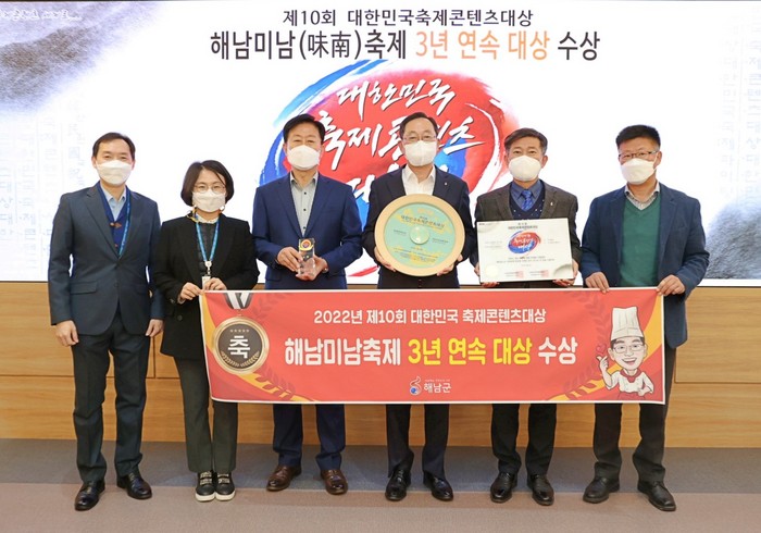 해남미남축제는 2020년 축제프로그램 연출 우수부문 대상, 2021년 비대면축제 부문 대상에 이어 올해 축제콘텐츠 부문 대상을 수상하며, 3년 연속 대상 수상의 영예를 안았다.