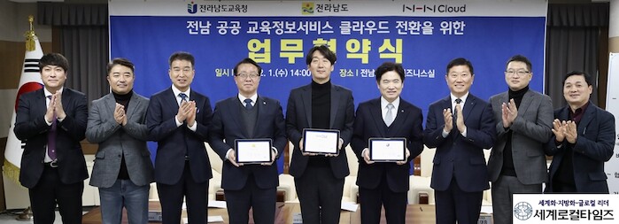 [세계로컬타임즈 김명진 기자] 전라남도교육청이 1일 청사 내 비즈니스실에서 전라남도·NHN클라우드와 전남 공공 교육정보서비스 클라우드 전환을 위한 업무협약(MOU)을 체결했다