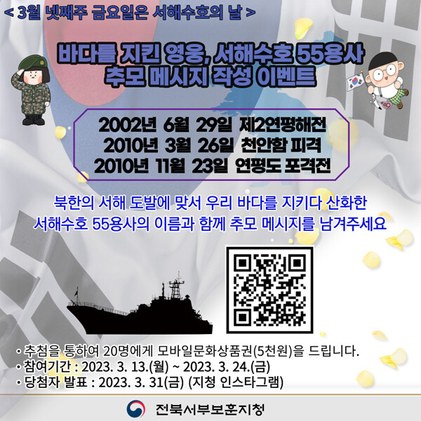 [세계로컬타임즈 조주연 기자] 국가보훈처 전북서부보훈지청이 제8회 서해수호의 날을 맞아 온라인 이벤트를 진행한다.