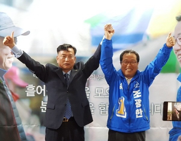 | ▲ 박유희 민주당 남양주시장 예비후보가 조광한 민주당 남양주시장 후보와 손을 들고 있다. <사진제공=조광한 후보 사무실> |