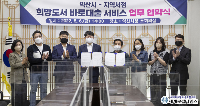 6일 익산시에 따르면 이날 익산 지역서점과 희망도서 바로대출 서비스 업무협약을 체결했다. 협약식에는 오택림 익산시장 권한대행과 서비스에 참여하는 6개 지역서점 대표가 참석해 원활한 사업 추진을 위해 힘을 모으기로 약속했다.