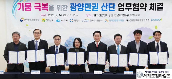[세계로컬타임즈 김명진 기자] 전남도가 14일 한국산업단지공단 전남지역본부에서 정부·지자체·공공기관·산업계와 함께 가뭄 극복을 위한 광양만권 산단 업무협약을 했다.