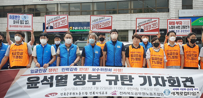 [세계로컬타임즈 조주연 기자] 전북공무원노조연맹(이하 노조)이 “임금을 인상해 달라”며 22일 오전, 국민의힘 전북도당 앞에서 ‘윤석열 정부 규탄 기자회견’을 가졌다.