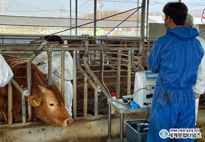 [세계로컬타임즈 조주연 기자] 전북 고창군 한우연구회가 농촌진흥청과 함께 ‘한우 우량암소 조기선발 신기술 시범사업’을 진행하고 있다.