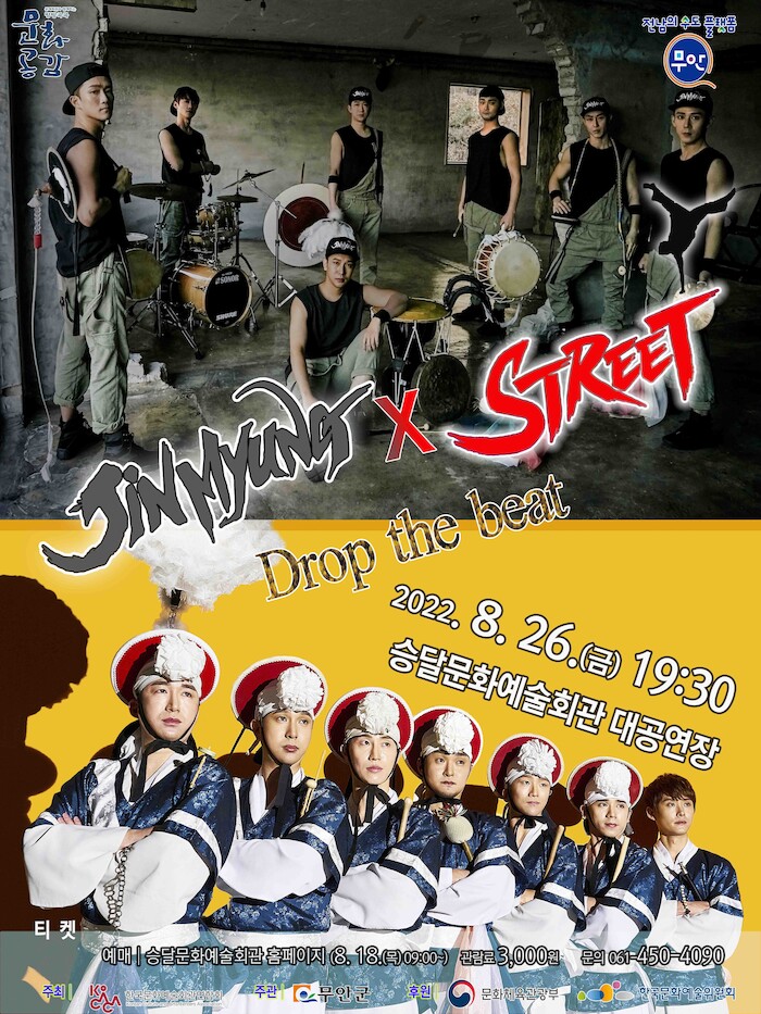 [세계로컬타임즈 박종현 기자] 무안군(군수 김산)은 2022년 문화공감방방곡곡 공모사업에 선정된 타악쇼 ‘진명×스트리트 Drop the beat’ 공연을 오는 26일 저녁 7시 30분 승달문화예술회관 대공연장에서 개최한다고 밝혔다.