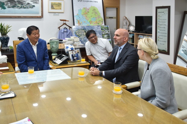 | ▲ 이석우 남양주시장(왼쪽)이 지난달 31일 희망케어 복지시스템의 창안 배경과 운영성과를 OECD 공공혁신 프로젝트 마르코 다길리오(Marco Daglio)팀장(왼쪽 세번째)에게 설명하고 있다.<사진제공=남양주시청> |