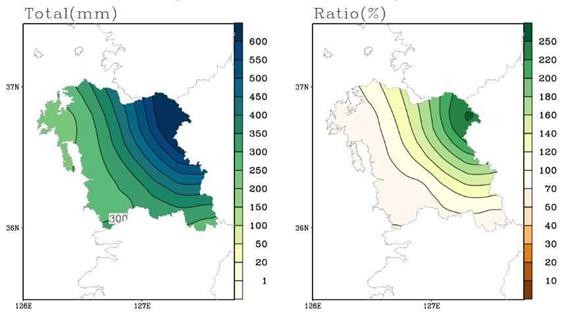 | ▲ 장마기간(6.24∼7.25) 강수량(㎜) 및 강수량 평년비(%) |