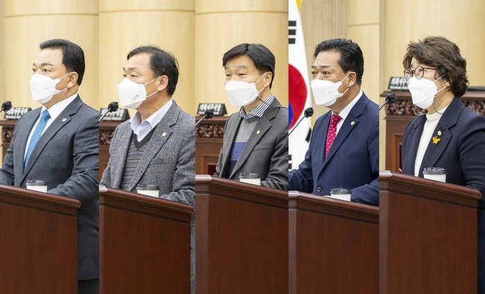 | ▲ 사진 왼쪽부터 이기환 박태순 김태희 김정택 나정숙 의원의 모습.(사진=안산시의회) |