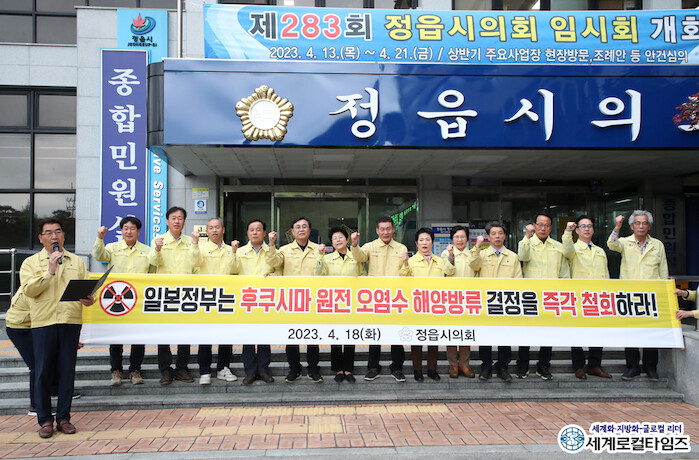 정읍시의회에 따르면 시의원들은 일본 정부가 지난 13일 후쿠시마 원전에 보관 중인 방사능 오염수를 해양에 방출한다는 결정의 부당함을 지적하고 시민의 뜻을 모아 일본 정부의 무책임한 오염수 해양 방류를 강력히 규탄하며 정부의 대책 마련을 요구했다.