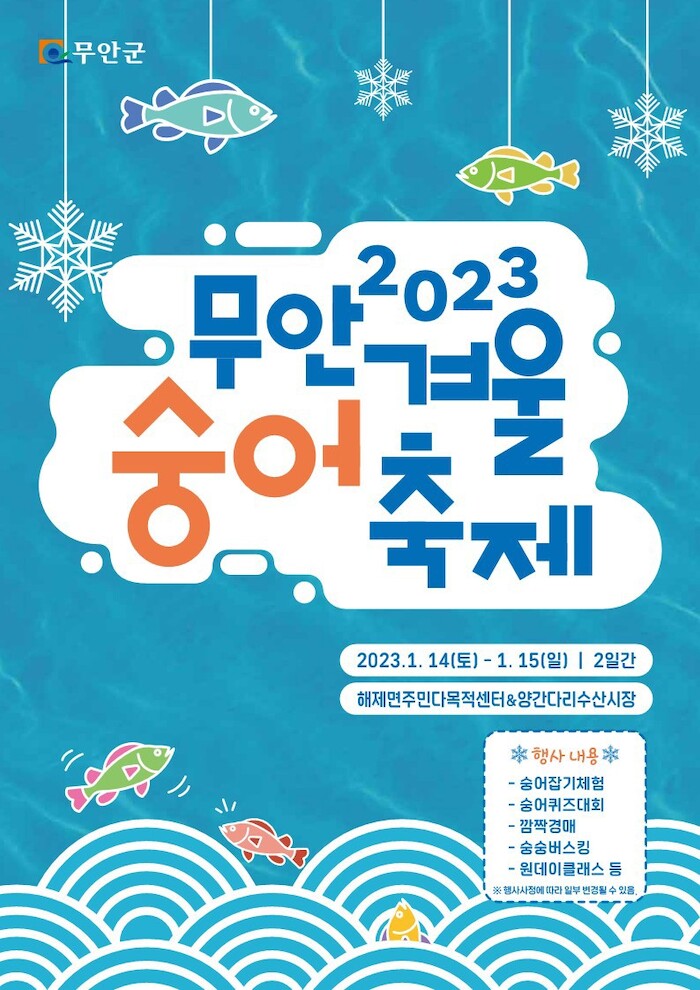 [세계로컬타임즈 박종현 기자] 전남 무안군은 쫀득하고 찰진 겨울철 대표 수산물로 무안5미 중 하나인 숭어를 소재로 2023년 1월 14일부터 15일까지 해제면 소재지 일원에서 2023년 무안 겨울 숭어 축제를 개최한다.