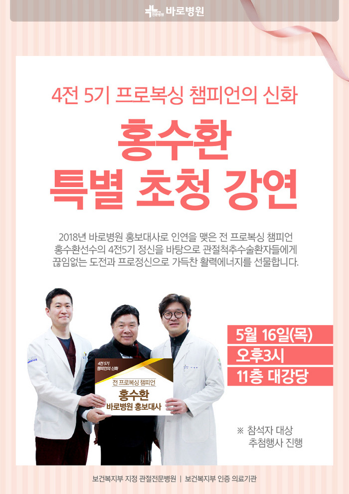 한편 4전5기의 신화 홍수환 前선수(현,한국프로복싱연맹회장)의 극복체험 초청강좌의 참여는 바로병원사회업실로 신청 가능하며 다양한 추첨행사를 함께 진행할 예정이다.