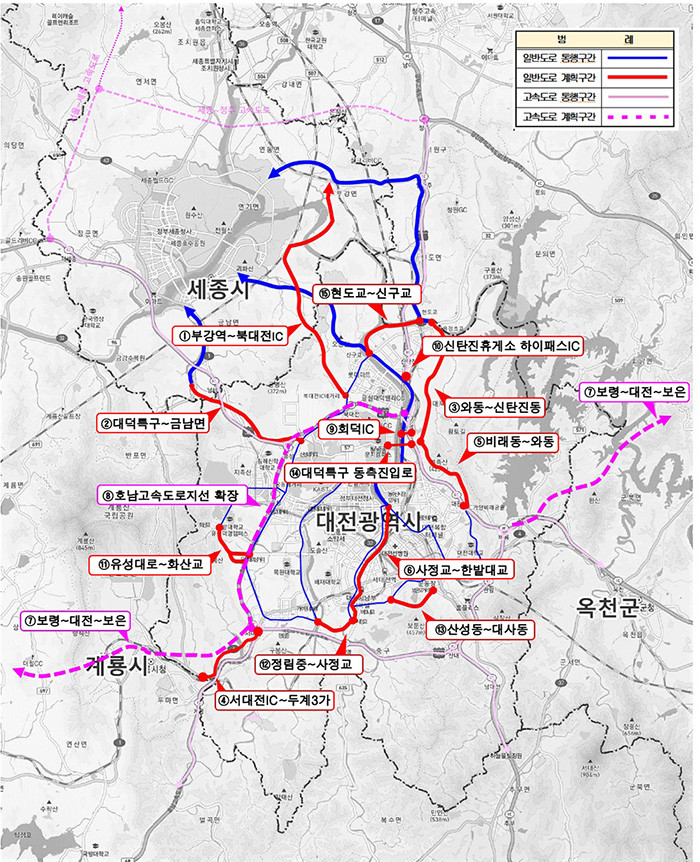 | ▲대전시에서 중점 추진하는 광역‧순환도로망 구축 사업도. 사진=대전시 |