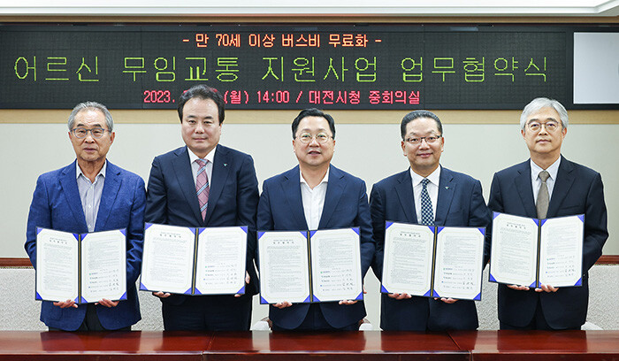 [세계로컬타임즈 민순혜 기자] 대전시가 17일 하나은행, 하나카드, 버스운송사업조합, 티머니와 ‘만 70세 이상 어르신 무임교통 지원사업을 위한 업무협약’을 체결했다.