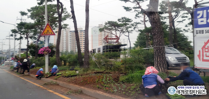 | ▲김제시 공공근로 작업자들이 도로변에서 아슬아슬하게 작업하고 있다(세계로컬타임즈 DB) |