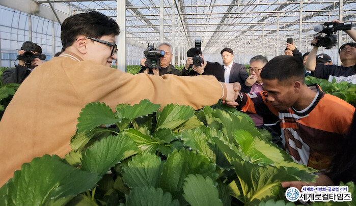 한동훈 장관은 완주군 삼례읍의 한 딸기 시설농장을 방문해 계절근로자 운영 상황을 확인하고 유희태 완주군수와 농장주, 계절근로자의 목소리를 들었다.