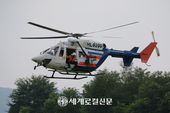 | ▲대전소방헬기가 야외훈련장에서 119 특수구조훈련을 실시하고 있는 모습. |