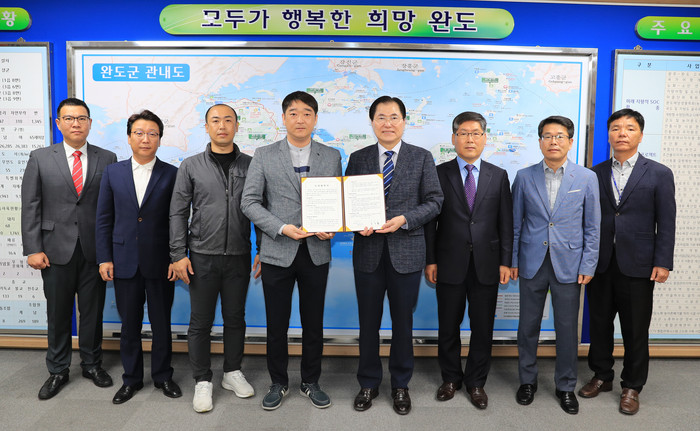| ▲ 전남 완도군과 (주)라온이 짚라인 설치 투자 협약 후 기념촬영을 하고 있다. <사진제공=완도군청> |