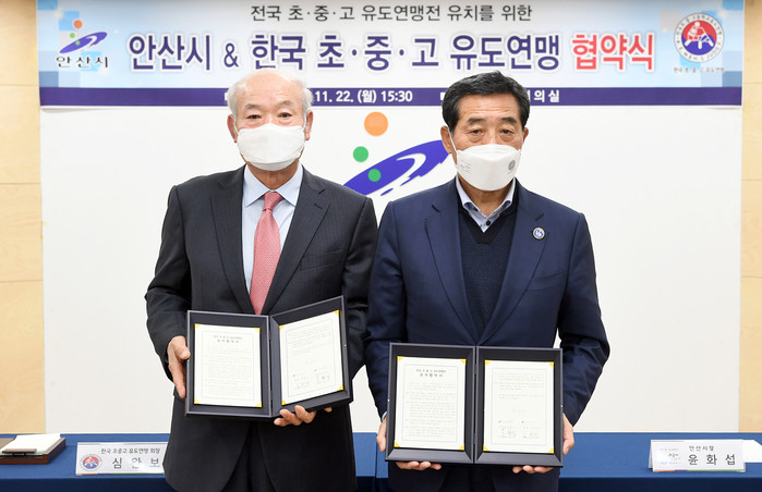 이날 안산시청에서 열린 협약식은 윤화섭 안산시장과 심완보 한국초·중·고 유도연맹 회장, 이용호 안산시 유도부 감독 등 관계자 8명이 참석한 가운데 진행됐다.