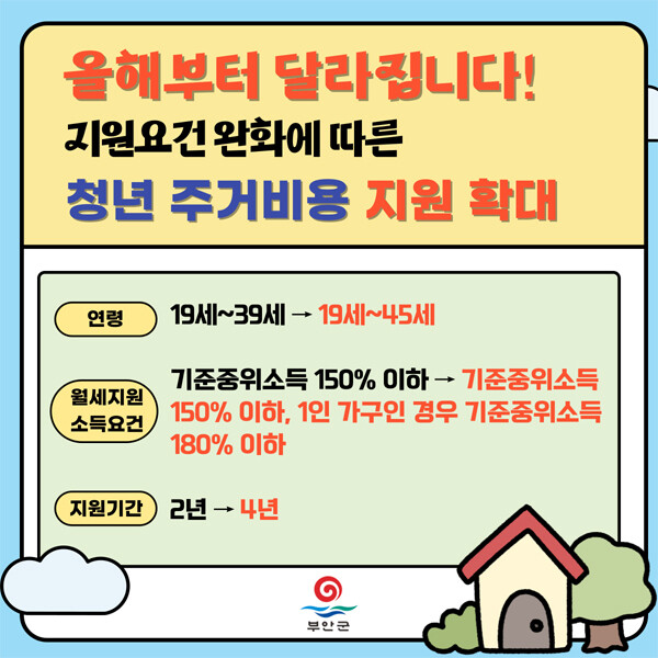 13일 부안군에 따르면 기존보다 연령을 늘리고, 월세지원 소득요건을 완화했으며 지원기간도 늘렸다.