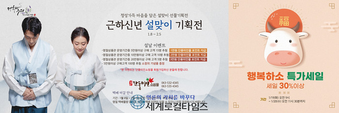 [세계로컬타임즈 조주연 기자] 전북 정읍시 농특산물 마켓 단풍미인쇼핑몰이 신축년 설 명절을 맞아 다음 달 5일까지 할인행사를 기획 운영한다.