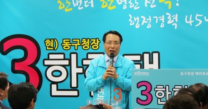 한현택 후보는 인사말을 통해 "구청장을 하면서 오직 구민들만 바라보고 걸어왔고 또 여러분이 원하는 곳에 항상 서왔다"면서 "(앞으로) 대전발전이 동구 중심으로 구민들이 낯부끄럽지 않게 당당하고 깨끗한 3선 구청장 도전에 결심했다"며 심정을 밝혔다.