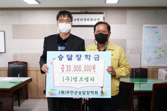 ㈜캠프밸리는 “지난 2년간 코로나19라는 어려운 여건 속에서 다행스럽게도 회사가 큰 어려움 없이 운영될 수 있었다”며“감사한 마음을 무안군민과 함께 하고 싶어서 장학금 기탁을 결정했다”고 전했다.