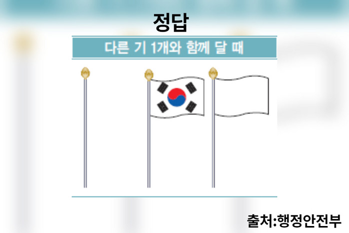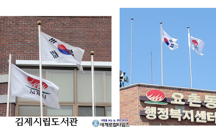 [세계로컬타임즈 글·사진 조주연 기자] 사진은 전북의 한 지자체 관련 두 건물의 국기 게양대 모습이다. 게양대가 3개인 경우로 국기와 다른 기 1개와 함께 달때 맞는 것은?
