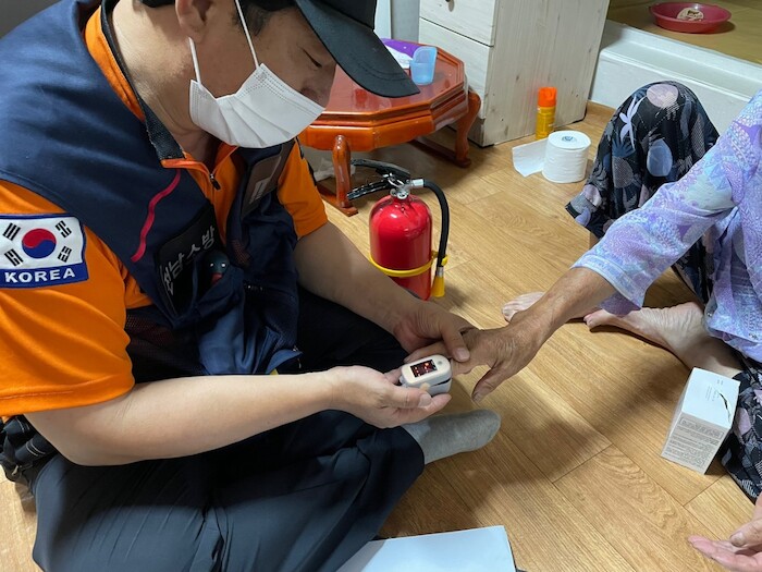 | ▲생활안전순찰대원이 혈압, 산소포화도 등 기본건강 체크를 하고 있다. (사진=순천소방서) |
