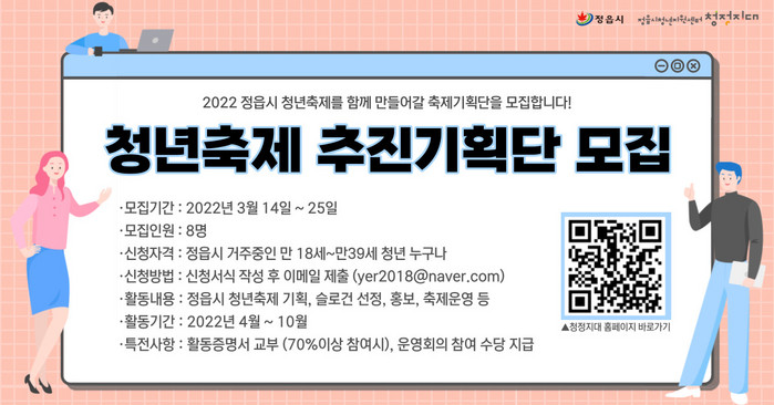 14일 정읍시에 따르면 오는 9월 청년의 날을 맞아 열리는 청년축제의 기획과 분야별 운영에 참여하게 될 청년축제 추진기획단을 오는 25일까지 모집한다.