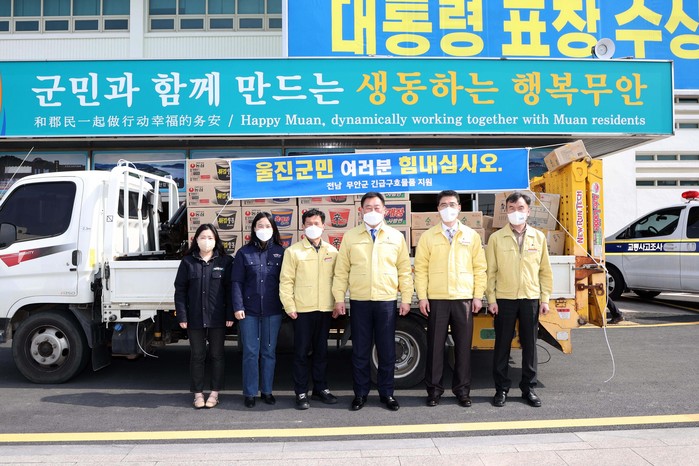 무안군에 따르면 7일 오후 무안군청에서 컵라면과 생수, 수건, 양파음료 등을 실은 차량이 7시간을 달려 울진군 이재민 대피소에 도착해 실의에 빠진 주민들에게 위로와 희망을 줬다.