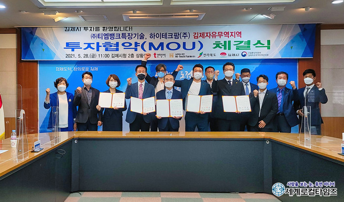 [세계로컬타임즈 글·사진 조주연 기자] ㈜티엠뱅크특장기술과 ㈜하이테크팜이 전북 김제자유무역지역 입주를 위한 투자협약을 체결했다.