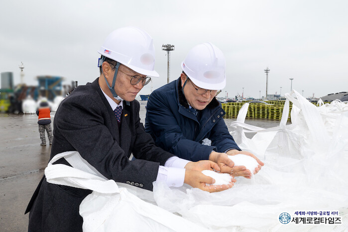 ▲6일 정헌율 익산시장이 베트남에서 군산항으로 들어온 요소를 살피고 있다. (사진제공=익산시) |